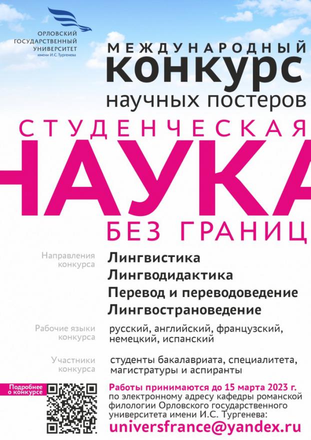 Подведены итоги IV Международного конкурса научных постеров «Студенческая наука без границ». Конкурс проводился кафедрой романской филологии Института иностранных языков Орловского государственного университета имени И.С. Тургенева с 17 февраля по 20 марта. Жюри рассмотрело 75 научно-исследовательских работ аспирантов, магистрантов и студентов ведущих вузов России и ближнего зарубежья.