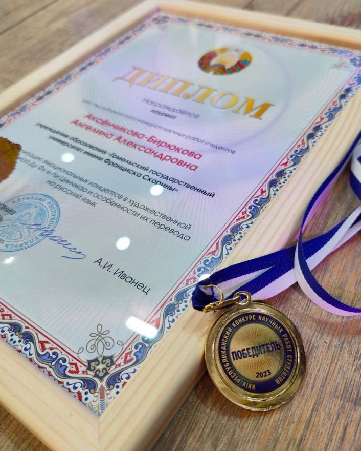 Среди них – аспирантка ГГУ имени Ф. Скорины Ангелина Аксёнчикова-Бирюкова с работой «Вербализация эмоциональных концептов в художественной картине мира Ду Фу и Ли Цинчжао и особенности их перевода на русский язык» и ее научный руководитель, д. филолог. наук, профессор кафедры русского, общего и славянского языкознания Владимир Коваль.