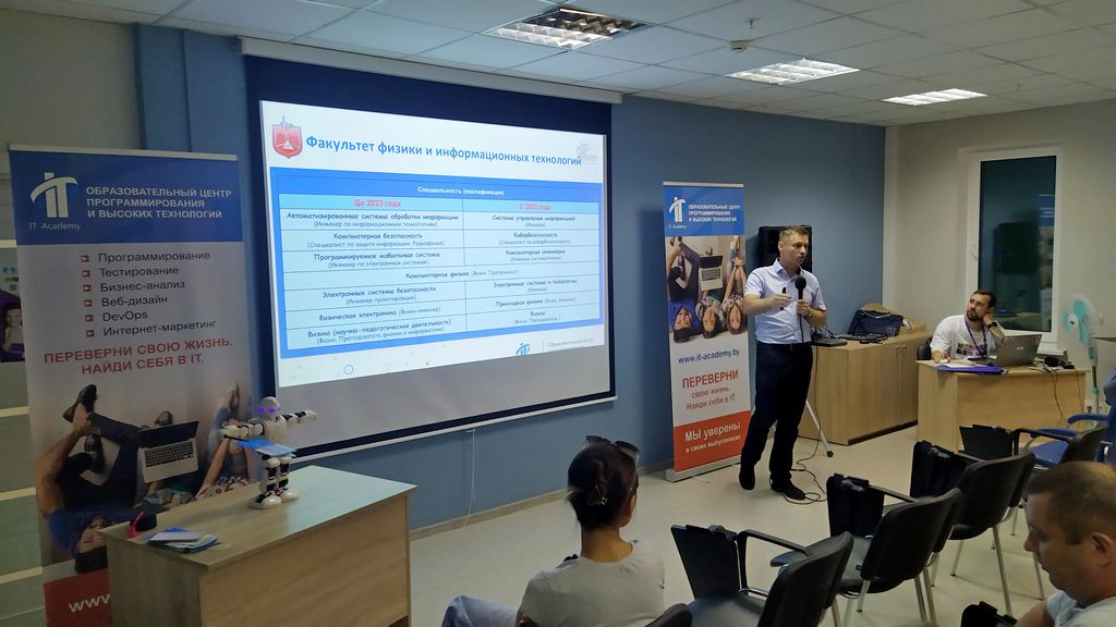 Декан факультета физики и информационных технологий Андрей Самофалов и заместитель декана факультета по учебной работе Андрей Середа приняли участие в «Фестивале современных технологий для детей и родителей», который проводил Образовательный центр ITeen Academy Гомель (https://openitkids.by/, https://gomel.iteen.by/). Андрей Леонидович был приглашен в качестве спикера с докладом «IT-специальности белорусских вузов. Что выбрать абитуриенту?» и рассказал о современных тенденциях в IT-отрасли, перечислил IT-профессии, которые востребованы на рынке труда, дал информацию об университетах Республики Беларусь, в которых можно получить качественное IT- и инженерное образование.