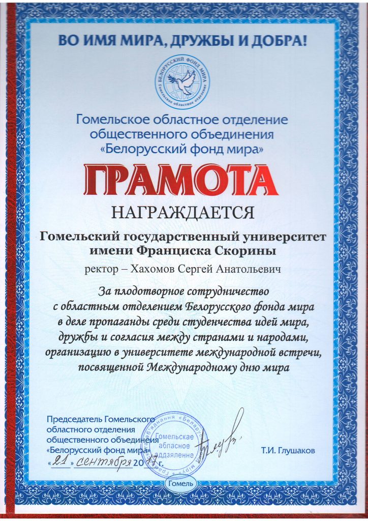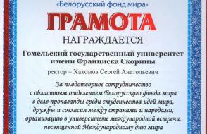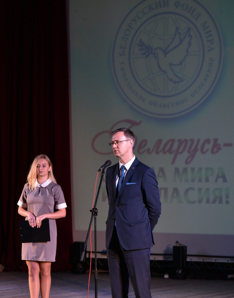 Идеи гармоничной свободной жизни, равенства и братства народов, добра и милосердия звучали из приветственных выступлений председателя правления Гомельского областного отделения «Белорусский фонд мира» Т.И. Глушакова, ветерана Великой отечественной войны А.И. Пимонова, Епископа Гомельского и Жлобинского Стефана, ректора ГГУ С.А. Хахомова и других гостей мероприятия.