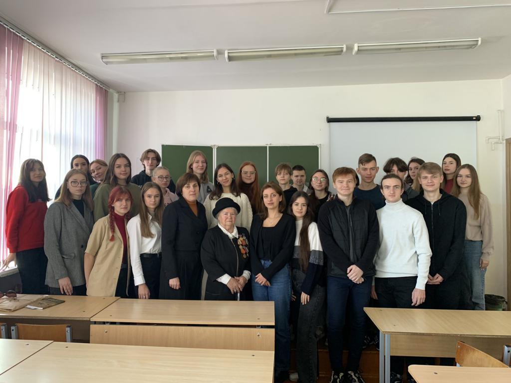 Продолжился цикл бесед встречей с малолетней узницей нескольких детских концлагерей в Германии Макаренко Тамарой Дмитриевной. Уроженку Гомеля Тамару Дмитриевну угнали в Германию, когда ей было пять лет. Скитаясь по немецким лагерям, не раз малышка вспоминала родной Гомель, маму и бабушку. Немало страданий выпало на долю маленькой гомельчанки, ведь на детях в концлагере испытывали лекарства, заражали различными болезнями, морили голодом. Вспоминая концлагерь, Тамара Дмитриевна плакала, а с ней плакали и наши студенты.