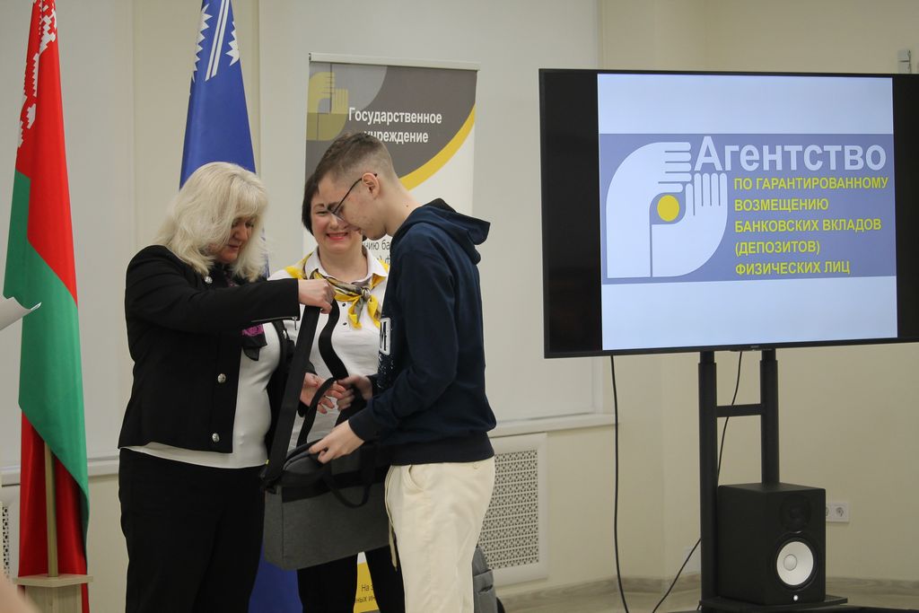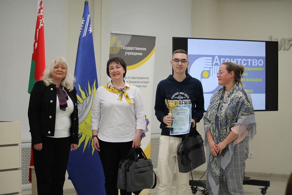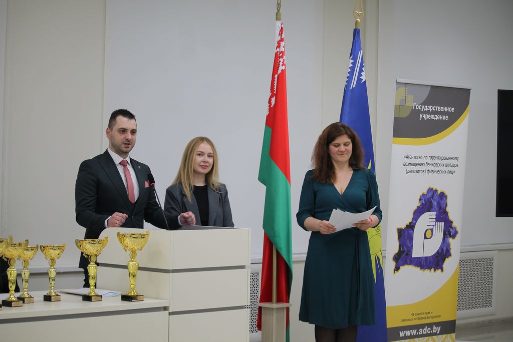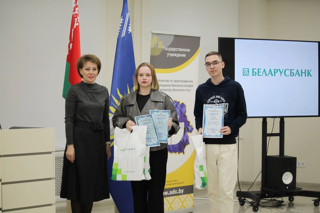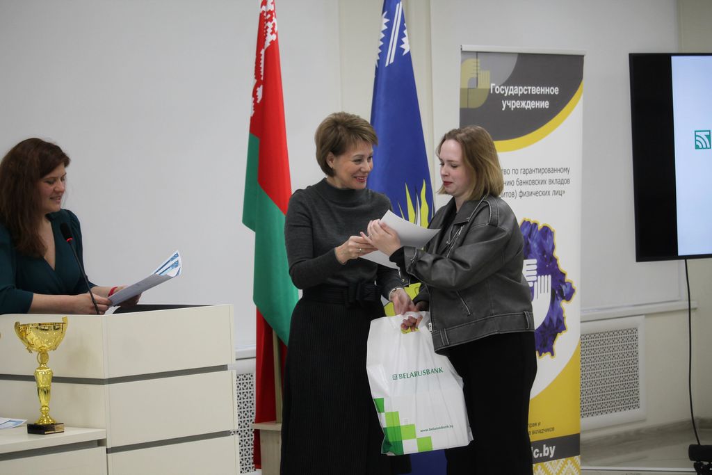 С приветственным словом к участникам конкурса обратилась начальник отдела обеспечения выплаты возмещения Агентства по гарантированному возмещению банковских вкладов физических лиц Татьяна Владимировна Черкасова и главный специалист отдела обеспечения выплаты возмещения Наталья Николаевна Смелова. Они поздравили и вручили призы абсолютным победителям конкурса среди учащихся учреждений общего среднего образования.