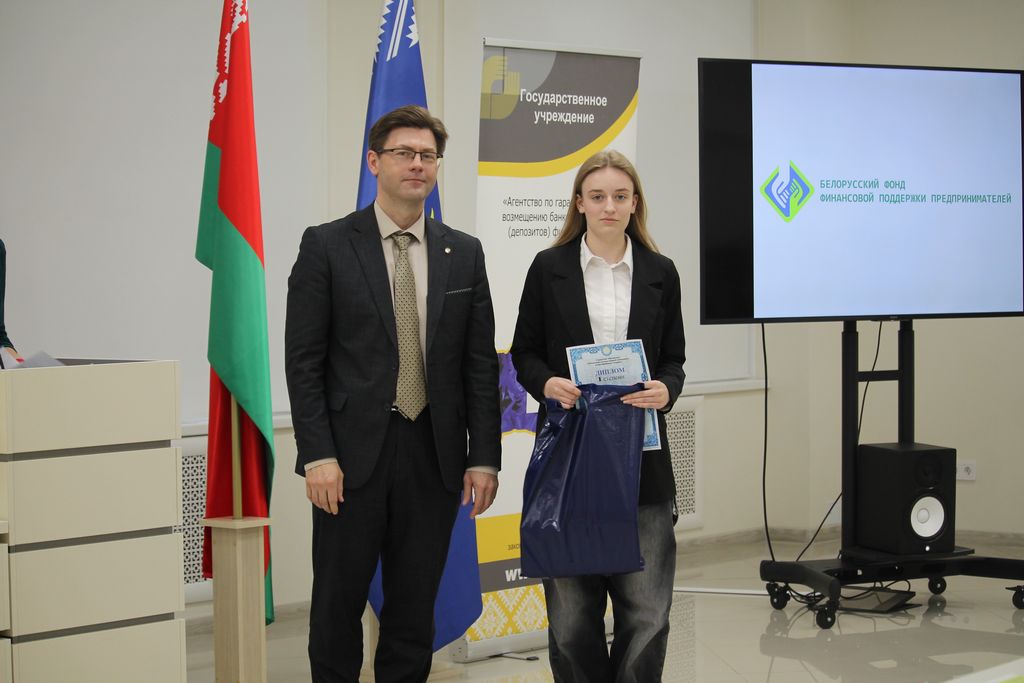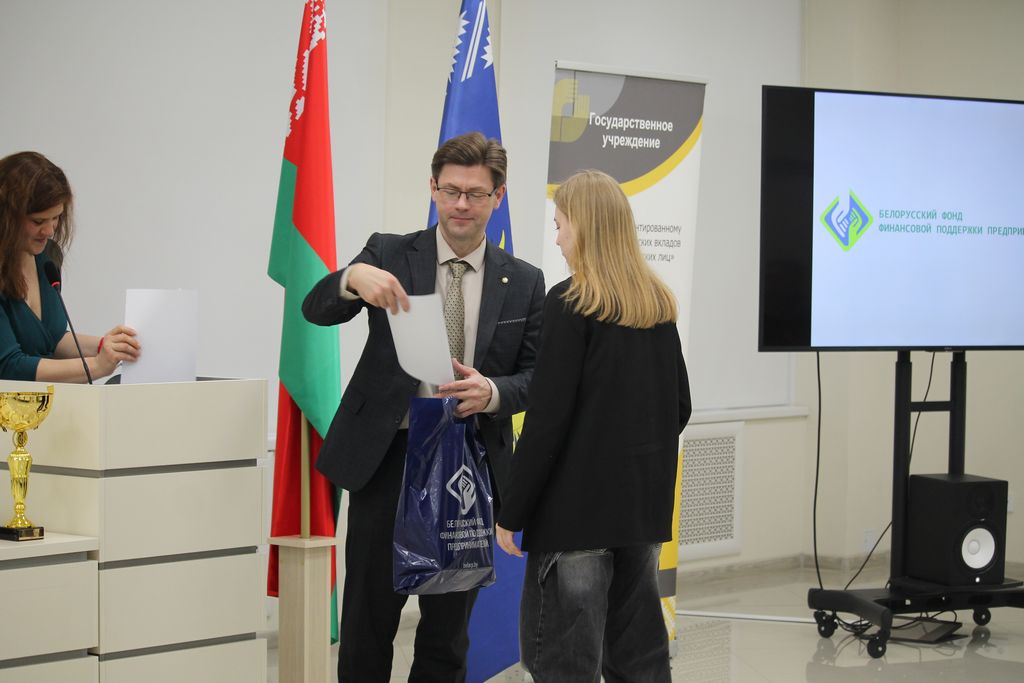 Торжественное награждение победителей конкурса началось с приветственного слова декана экономического факультета – Андрея Костенко, который вручил дипломы и призы победителям 1 тура конкурса от нашего информационного партнера Белорусского фонда финансовой поддержки предпринимателей в лице генерального директора Петра Борисовича Арушуньянца: 1 место – Татьяна Фоменко, СШ № 11 г. Мозыря; 2 место – Диана Кавунова, ГГАЭК; 3 место – Екатерина Сороколетова, ГГАЭК.