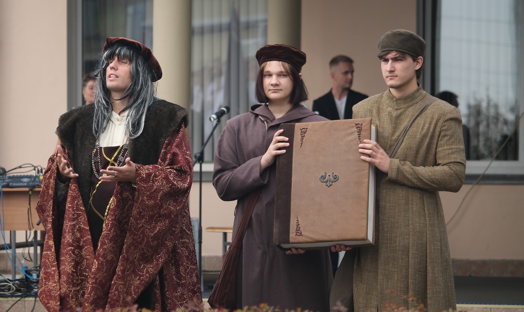 Традиционно студентам первого курса были вручены символический студенческий билет и ключ знаний, кроме того, в театрализованной постановке было передано напутствие следующим поколениям от самого Франциска Скорины.