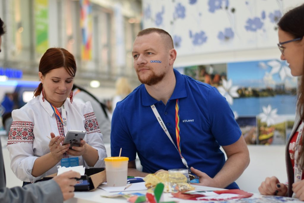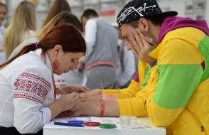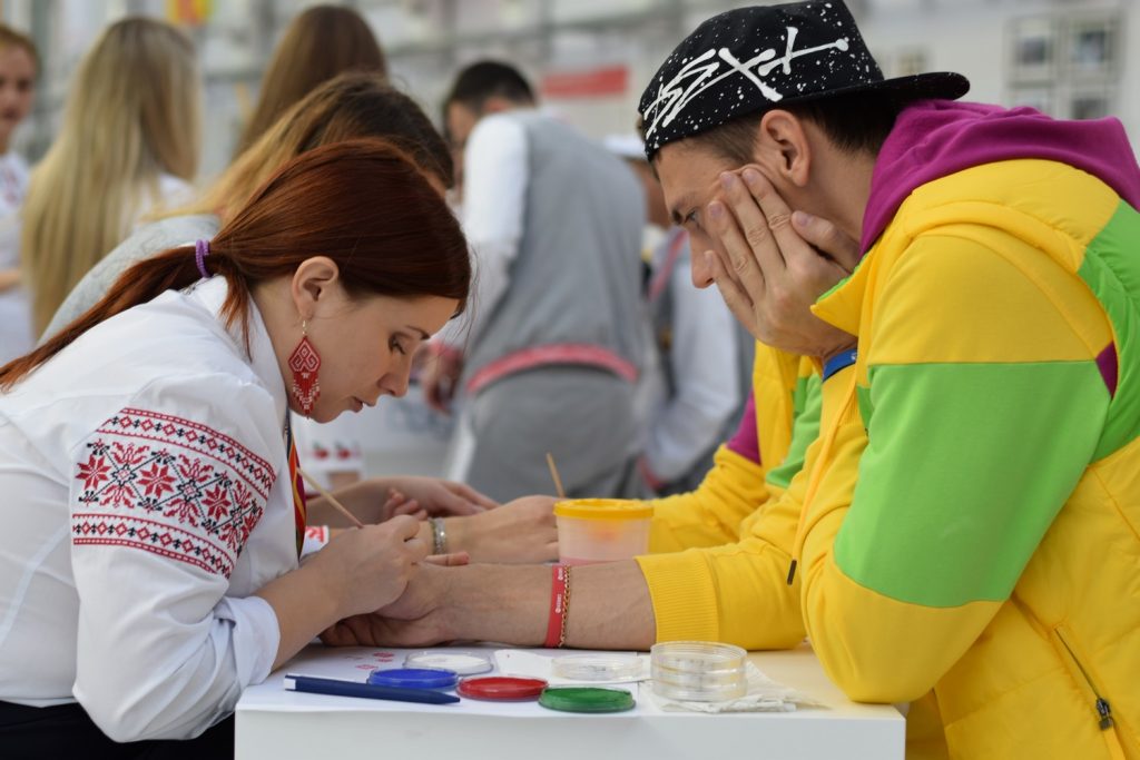 Татьяна не только принимала участие в интерактивных площадках, но и помогала в работе белорусской выставки. Девушка занималась бодиартом – наносила изображения белорусских символов на лица и руки участников форума. Так, художественные способности студентки были высоко оценены ребятами из разных уголков мира.