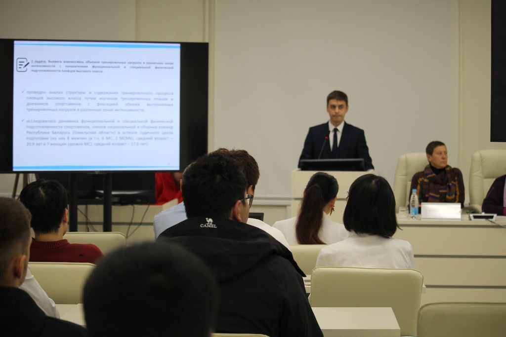 - Сергей Мельников, старший преподаватель кафедры теории и методики физической культуры ГГУ имени Ф. Скорины, представил исследование на тему «Управление спортивной тренировкой пловцов высокого класса на основе показателей функциональной подготовленности».