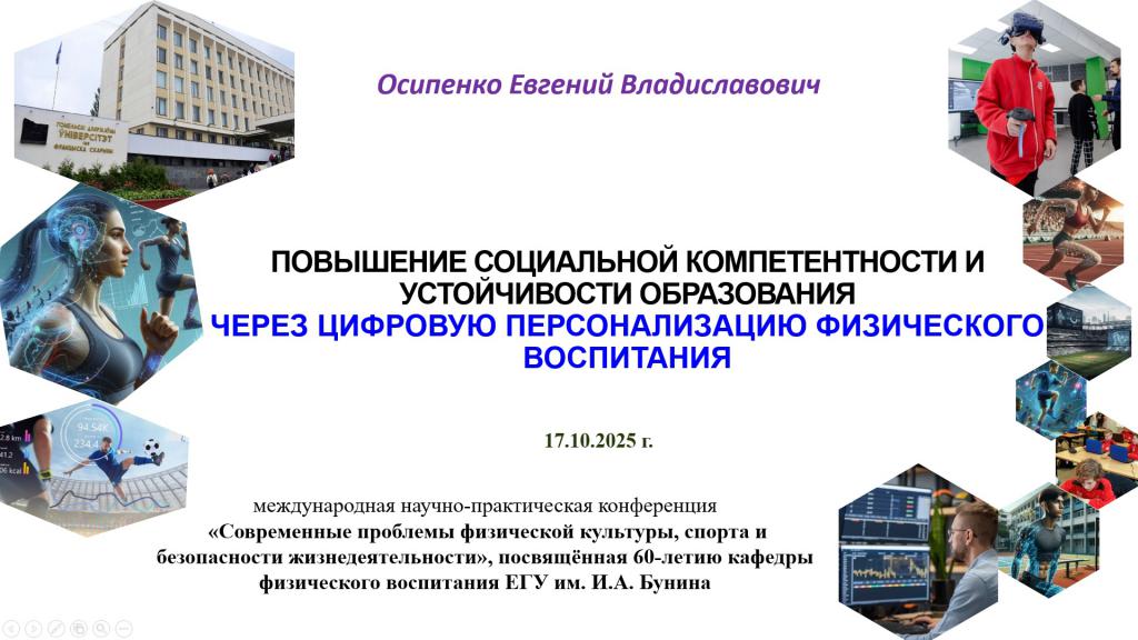 Ярким событием утреннем сессии стало выступление заведующего нашей кафедрой теории и методики физической культуры – Евгения Осипенко. Его пленарный доклад «Повышение социальной компетентности и устойчивости образования через цифровую персонализацию физического воспитания» задал высокий научный уровень дискуссии. Евгений Владиславович детально раскрыл, как современные цифровые инструменты позволяют создавать персонализированные программы физвоспитания, способствующие не только укреплению здоровья, но и развитию гибких навыков у обучающихся, что крайне актуально для современного образования.
