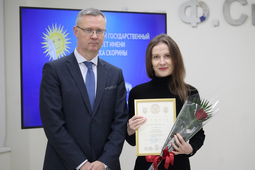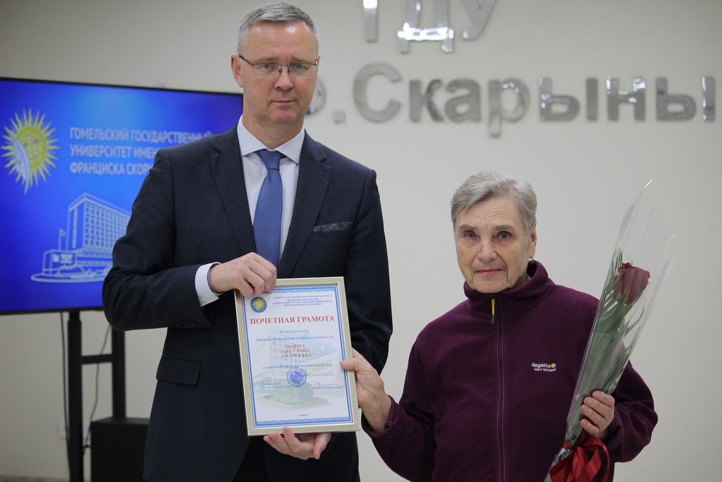 Грамотой университета награждены старший преподаватель кафедры теоретической физики Светлана Лукашевич и дежурный пульта управления отдела охраны и безопасности Игорь Вишняков.
