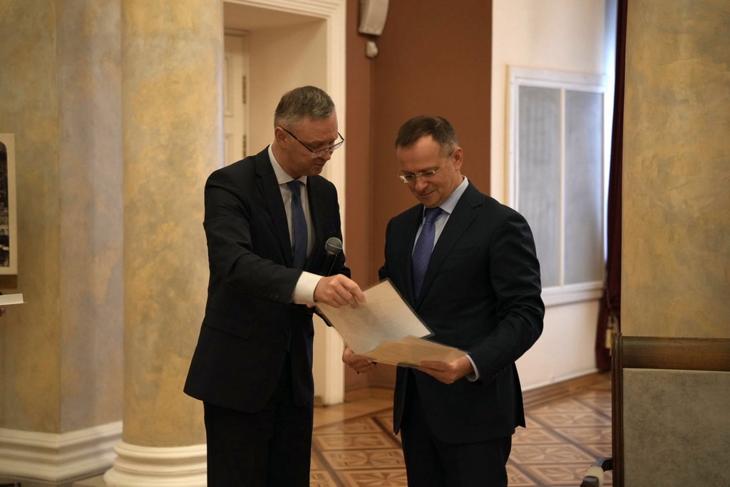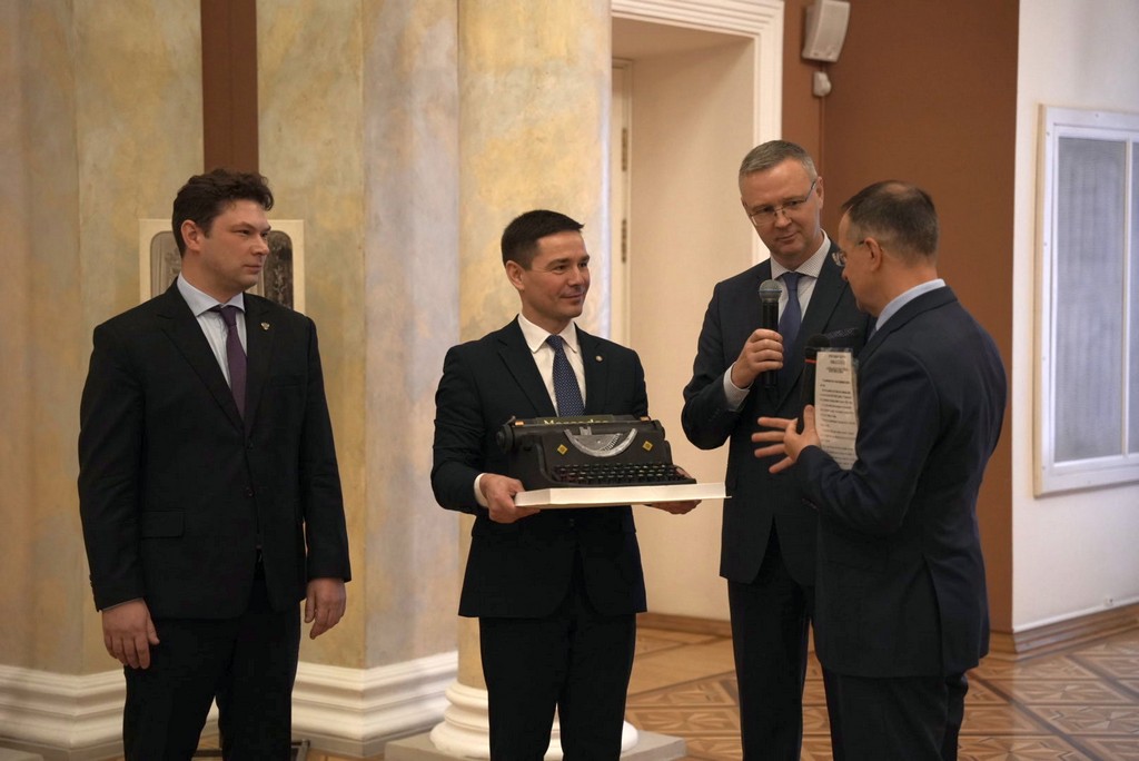 Ректор университета Сергей Хахомов вручил Владимиру Мединскому символичный торт в виде печатающей машинки. Этот необычный подарок отражает тесную связь легендарного полководца, Маршала Советского Союза Константина Константиновича Рокоссовского, с вузом в годы Великой Отечественной войны. Вместе с тортом Сергей Анатольевич передал копии уникальных документов – писем, которые коллектив Гомельского педагогического института в 1944 году направил командующему войсками Белорусского фронта К. К. Рокоссовскому. Владимир Ростиславович с искренней благодарностью принял подарки и заверил, что они займут достойное место в экспозиции Музея военной истории Российского военно-исторического общества.