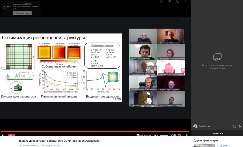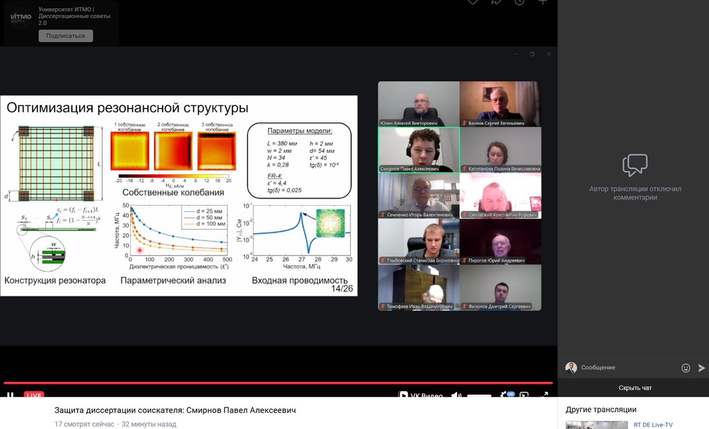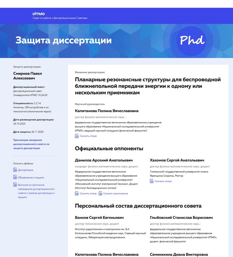 26 ноября 2025 года ректор Гомельского государственного университета имени Франциска Скорины Сергей Анатольевич Хахомов принял участие в заседании диссертационного совета в Университете ИТМО (Санкт-Петербург, РФ) в качестве официального оппонента по диссертации Смирнова Павла Алексеевича на тему «Планарные резонансные структуры для беспроводной ближнепольной передачи энергии к одному или нескольким приемникам» на соискание ученой степени кандидата технических наук по специальности 2.2.14. «Антенны, СВЧ-устройства и их технологии».