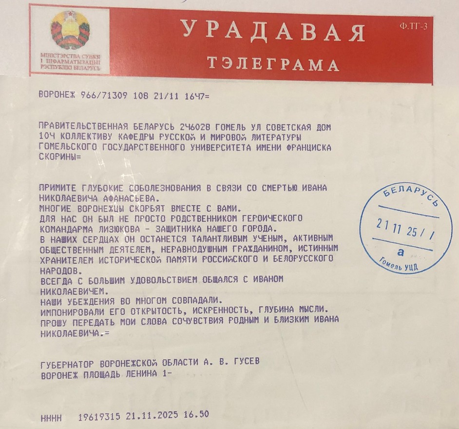 В связи с внезапной трагической кончиной заведующего кафедрой русской и мировой литературы нашего университета АФАНАСЬЕВА ИВАНА НИКОЛАЕВИЧА в адрес коллектива кафедры поступила следующая Правительственная телеграмма от губернатора Воронежской области АЛЕКСАНДРА ВИКТОРОВИЧА ГУСЕВА