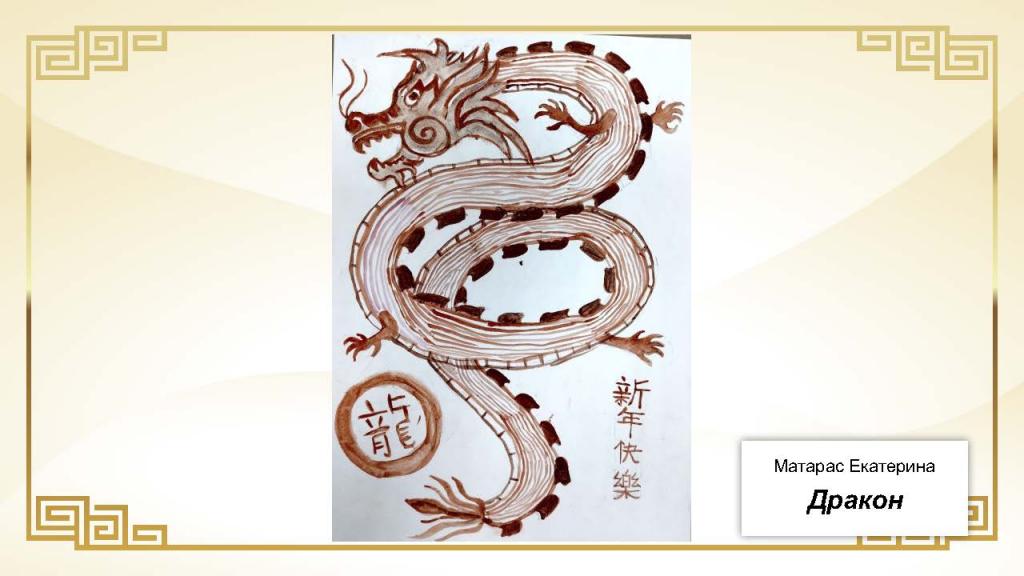 Всего на конкурс было представлено 37 работ. Основу экспозиции составили живописные и графические произведения, выполненные в различных техниках — от карандашного рисунка и акварели до гуаши. Значительное место заняли декоративно-прикладные работы: изображения китайского дракона в форме рисунков, аппликаций и скульптур, а также традиционные мотивы китайской архитектуры, в том числе пагоды из бумаги и дерева.