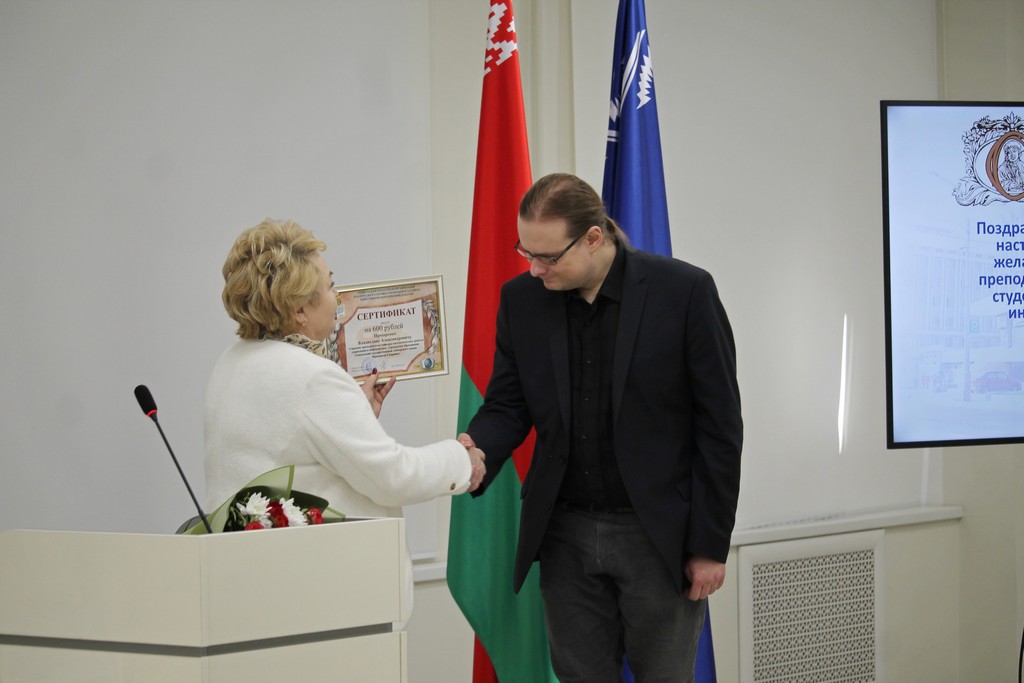 Почетная грамота за многолетнюю плодотворную учебную и воспитательную работу по подготовке квалифицированных специалистов была вручена старшему преподавателю кафедры экономической информатики, учета и коммерции Сергею Шикальчику.