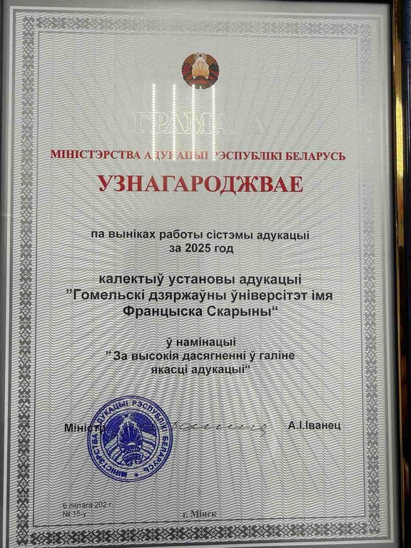 По результатам работы системы образования в 2025 году коллектив Гомельского государственного университета имени Франциска Скорины награжден грамотой Министерства образования Республики Беларусь в номинации «За высокія дасягненні ў галіне якасці адукацыі».