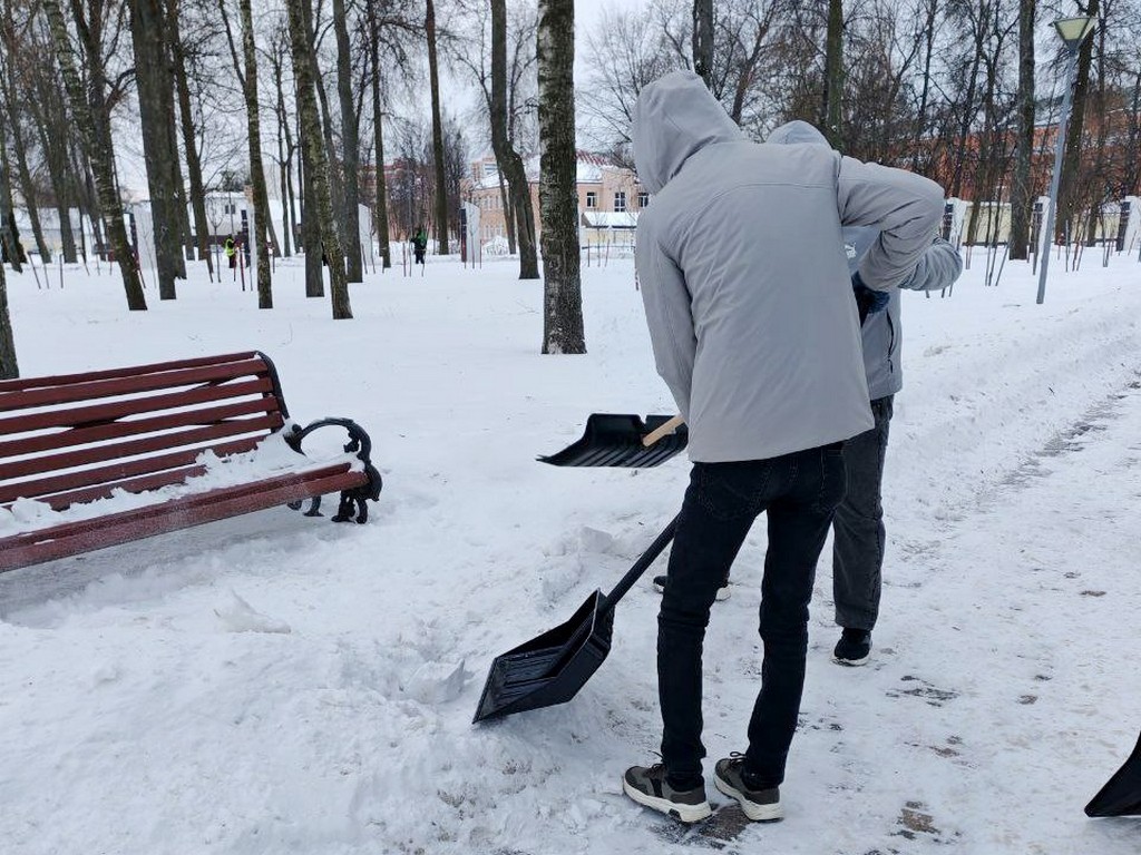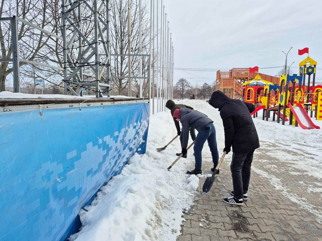 Кроме того, волонтерская помощь была оказана в районе Ледового дворца. Здесь ребята убрали снег на прилегающей территории, расчистили подходы и пешеходные зоны.
