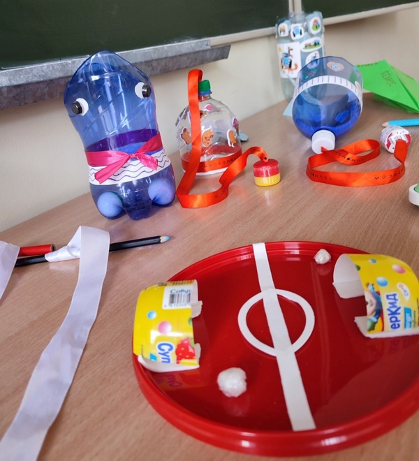 Особый интерес у студентов вызвало изготовление старинной французской игры «бильбоке». Эта игрушка, представляющая собой шарик, прикреплённый к чашечке, эффективно развивает глазомер, координацию движений и ловкость. Важным направлением работы с дошкольниками является развитие дыхательной мускулатуры. Для решения этой задачи студенты изготовили тренажёр «Ветерок в бутылке» и «Дыхательный мини-футбол». Ещё студенты конструировали пособия для развития мелкой моторики – подвесные конструкции. Такие игрушки тренируют мелкие мышцы кисти, что напрямую связано с развитием речи и мышления дошкольника.