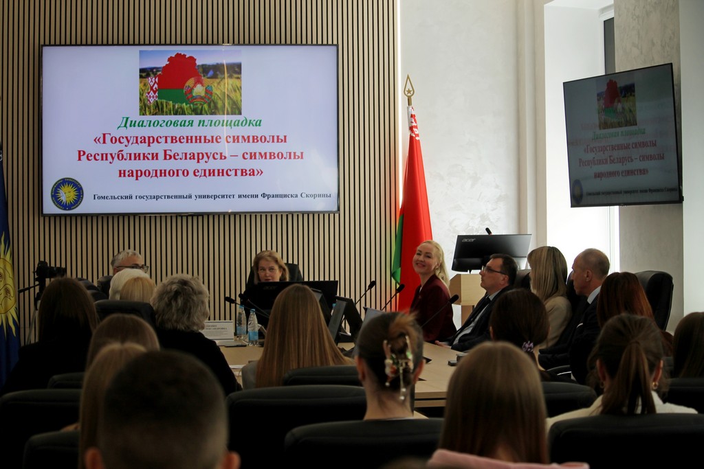 В Гомельском государственном университете имени Франциска Скорины состоялась диалоговая площадка, посвященная государственной символике Республики Беларусь. Мероприятие приурочено к празднованию Дня Государственного флага, Государственного герба и Государственного гимна Республики Беларусь. Этот значимый государственный праздник отмечается в нашей стране во второе воскресенье мая – 10 мая в этом году.