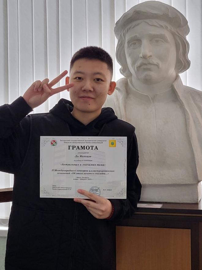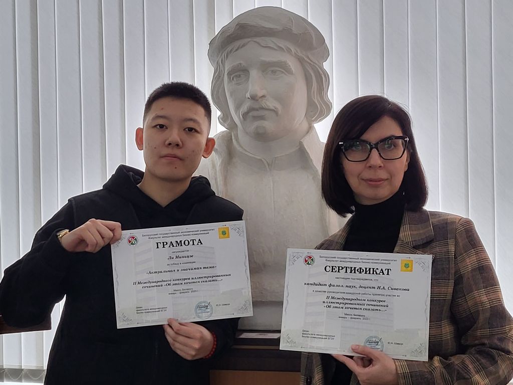 我校外国语学院三年级学生李敏杰(中国)代表我校参赛。 在她的文章“吸烟:社会形象或自由选择”中,敏洁不仅谈到了吸烟的危害,还谈到了每个人在生活中有意识地做出决定的必要性。 比赛评委会为在“实际且重要的主题”提名中获胜的作品颁发了证书。 负责教育工作的副校长德米特里·霍达诺维奇 (Dmitry Khodanovich) 祝贺选手取得的成就,并为她颁发了当之无愧的奖项。